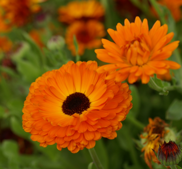 Voimakkaan oranssi, suurikukkainen, kokonaan kerrottu lajike, korkeus noin 60 cm. Tuottaa paljon terälehtiä.
