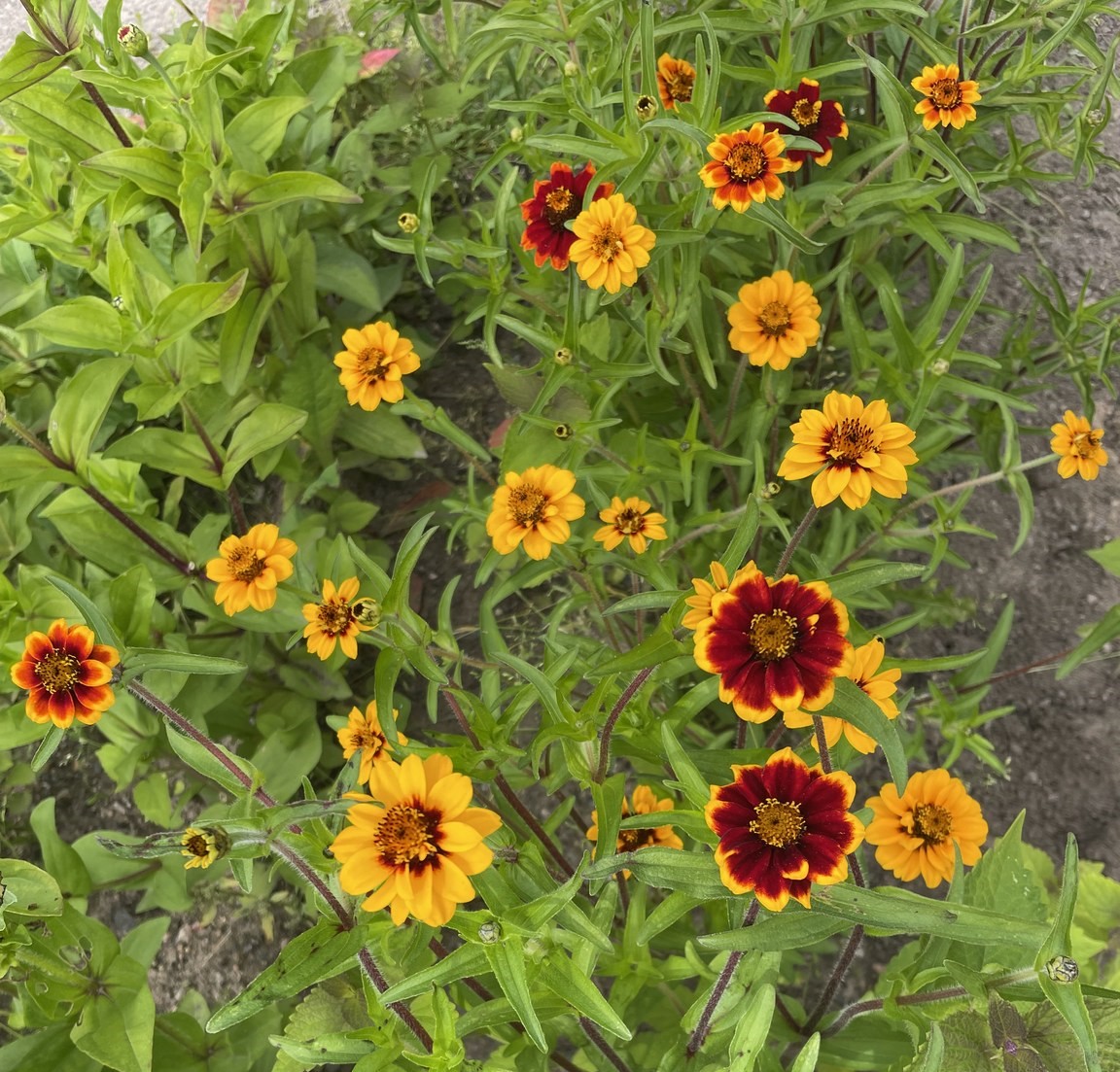 Yksivuotinen. Syksyinen värisekoitus keltaisen, oranssin ja mahongin värisistä pienehköistä puolikerrotuista ja kerrotuista kukista. Korkeus 30-50 cm.