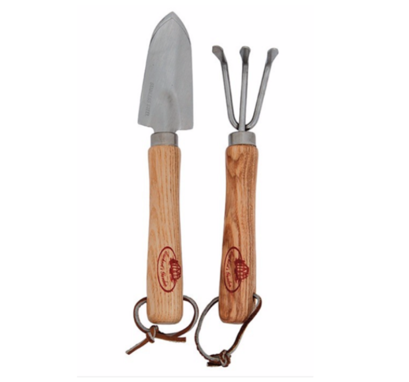 Pikkuiset työvälineet ruukkukasvien ja taimien hoitoon sekä avuksi koulintaan. Leveämpi herttamainen lapio ja kolmipiikkinen hara, korkeus noin 17-18 cm.