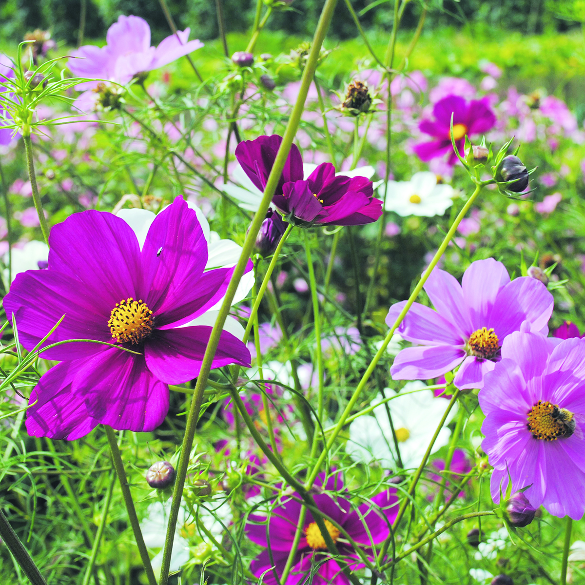 Korkeus n. 100 cm. Yksinkertaisten kukkien väri vaihtelee tumman pinkistä vaaleanpunaiseen ja valkoiseen.