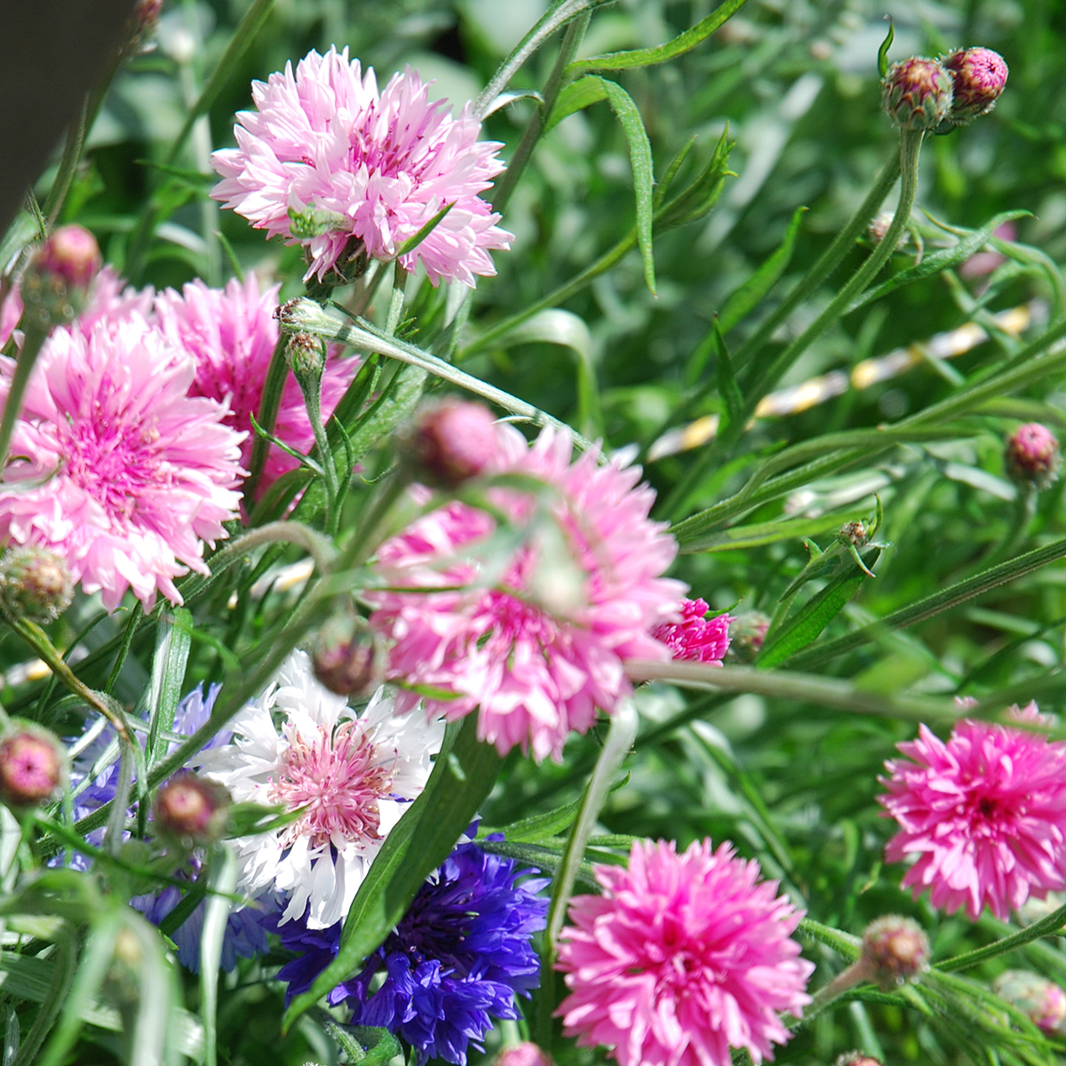 Korkeus n. 90 cm. Sekoitus sinisiä, vaaleanpunaisia ja valkoisia kukkia.