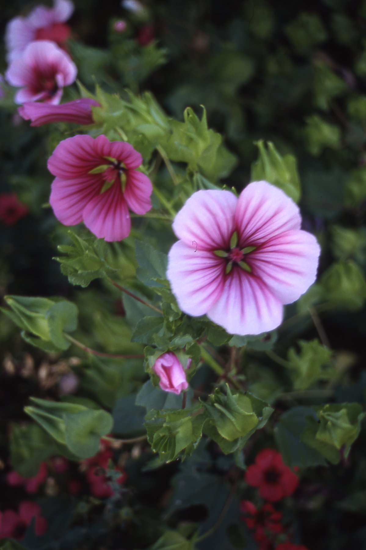 Sekoitus kukista, joiden suonikkaat terälehdet ovat valkoiset, tumman tai vaalean ruusunpunaiset. Nielu on tumma.