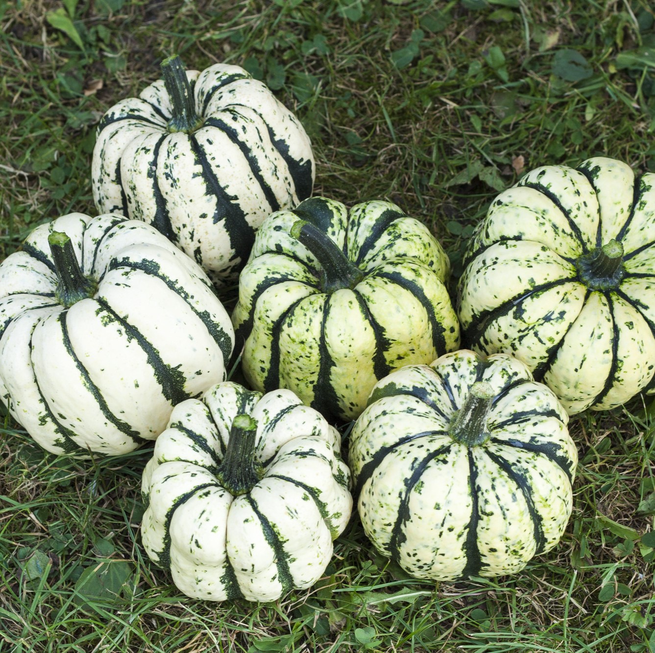 Kermanvaalea koristeellinen hedelmä, jossa on tummanvihreitä raitoja ja kuvioita. Oranssi malto on maultaan pehmeän pähkinäinen. Hedelmä on pyöreähkö ja pieni, paino noin 200-500 grammaa. Säilyy pitkään.