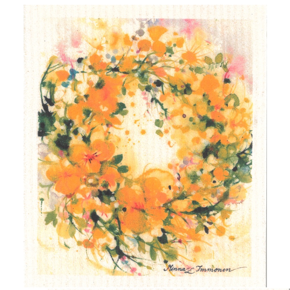 ”Tiskirätti Orvokkikranssi ilahduttaa arjen askareissa ja tahrojen pyyhkiminen on nopeaa ja sujuvaa. Keväinen kukkakimppu ilahduttaa myös ystävää vaikka kauniin arkisen esineen muodossa.”