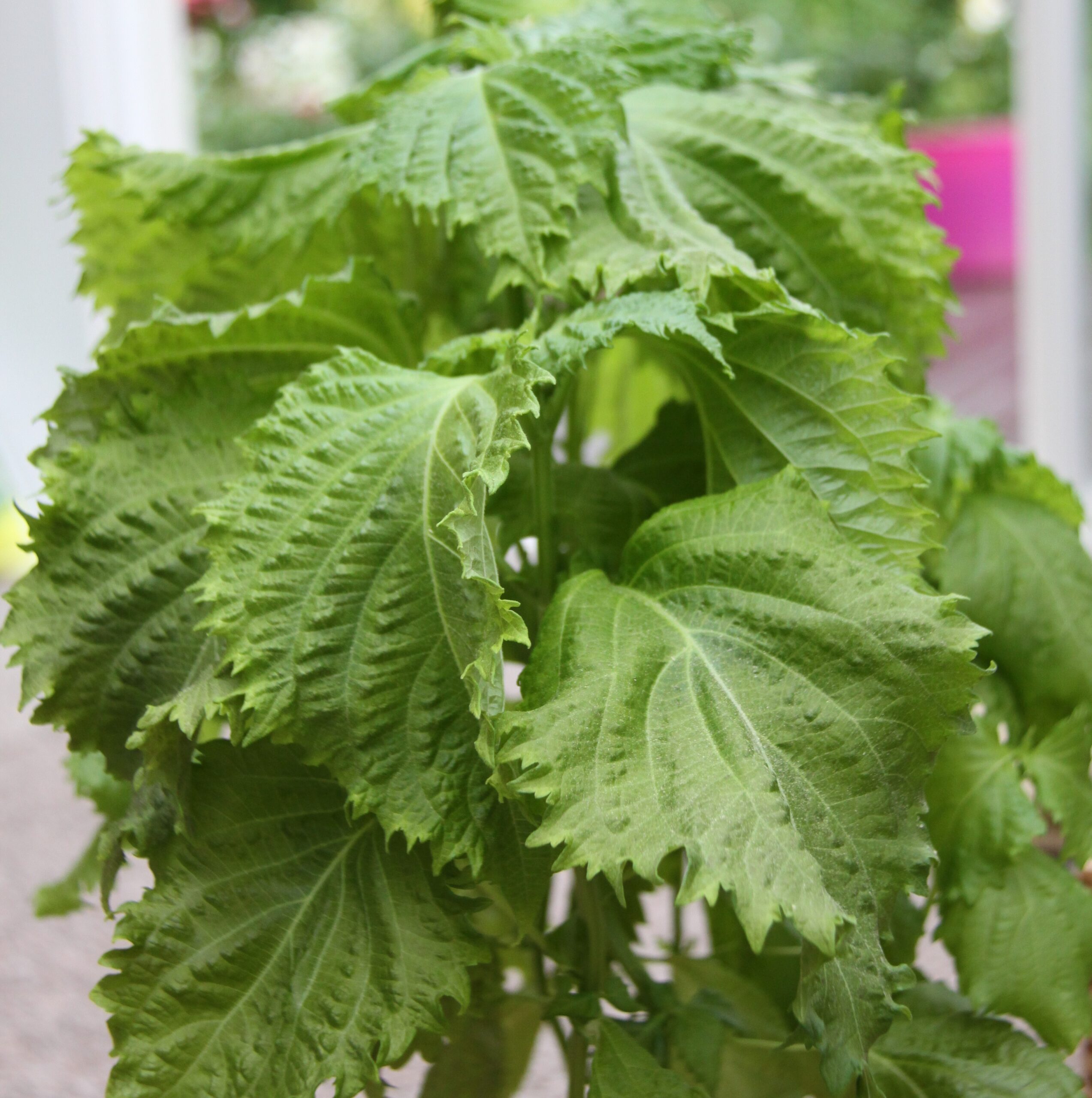 Vihreät tasaiset lehdet muistuttavat nokkosen lehteä, valkoiset kukat. Korkeus 60 cm. Antaa hienon aromin kalaruokiin. Shisonakin tunnettu.